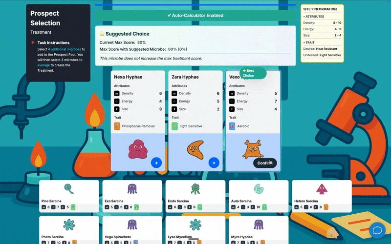 Perfect for learning the scoring logic and understanding optimal microbe combinations.