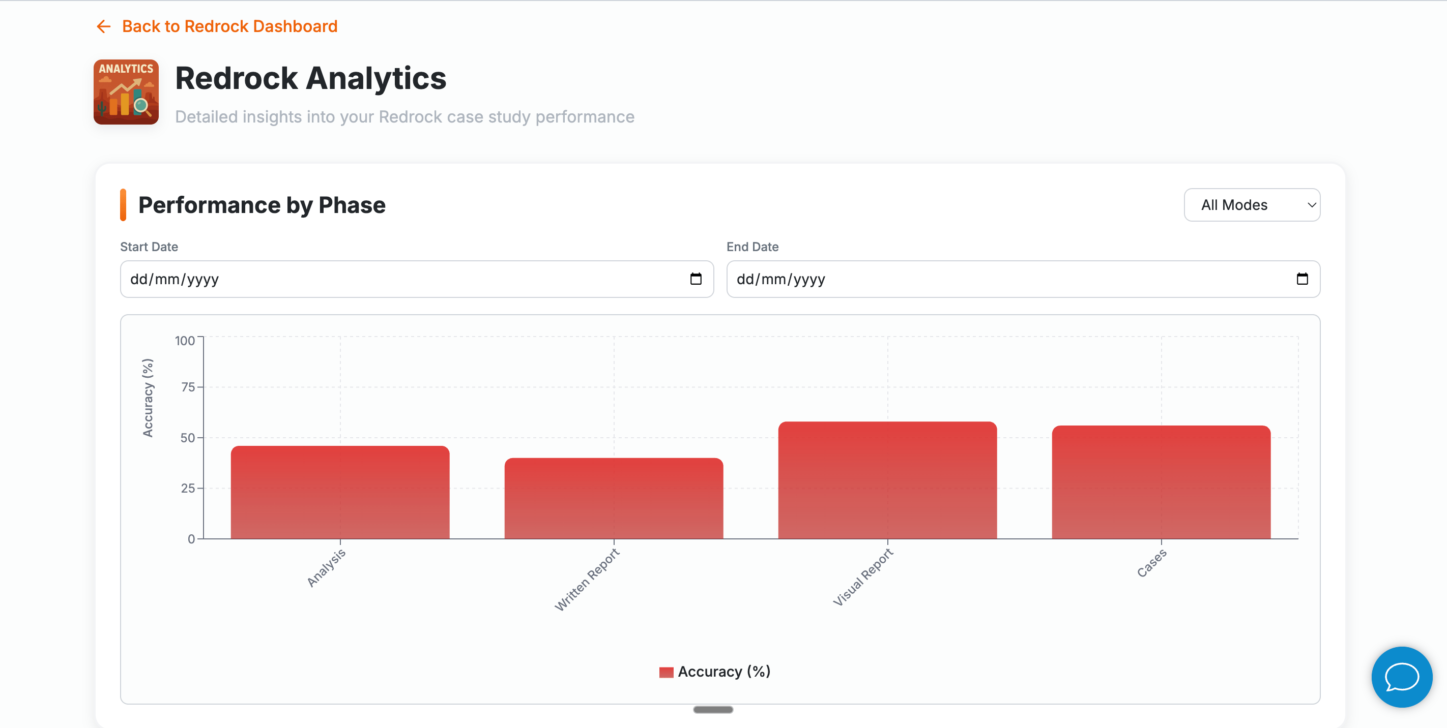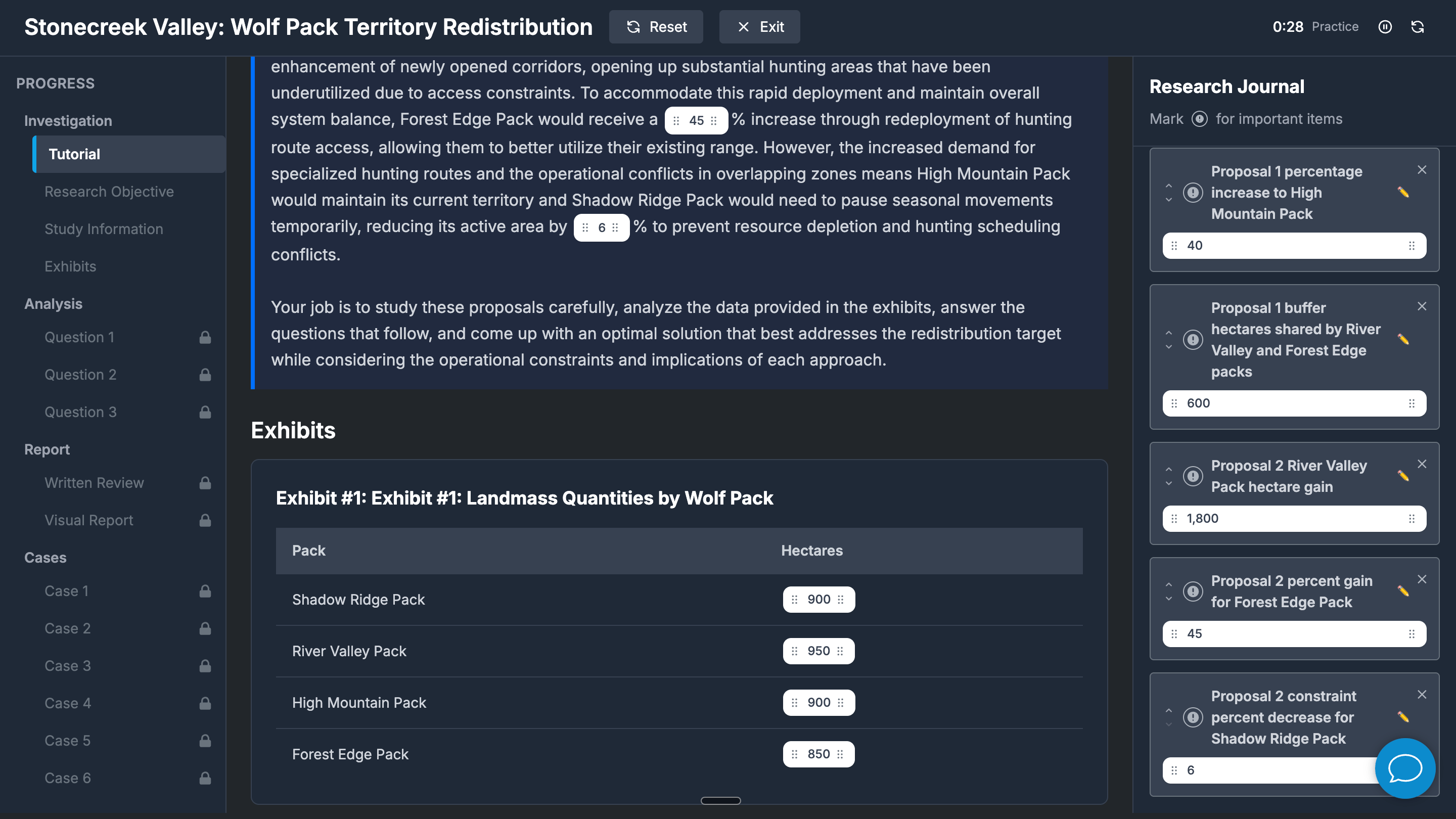 Practice 10 full-length cases with realistic question wording, interactive exhibits, and three-phase structure mirroring the exact ambiguity of real Redrock assessments.