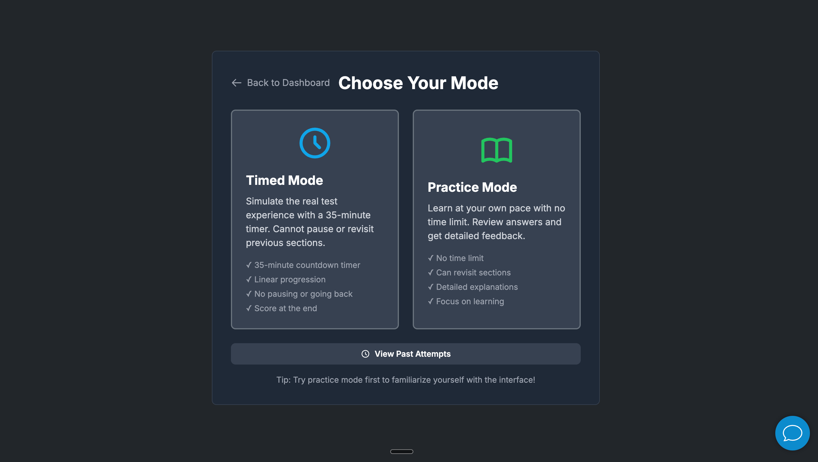 Choose between untimed practice mode to learn question patterns or timed assessment mode that replicates real test-day pressure.